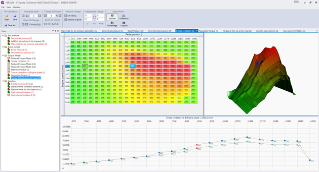 The folowing maps are available for editing: rail pressure, target fuel quantity, requested torque, torque limitation, boost pressure. For more efficient tuning also you can edit correction and limitation maps for main parameters, maps to control output circuits (injection quantity regulator, rail pressure regulaor), DTC mask, etc.