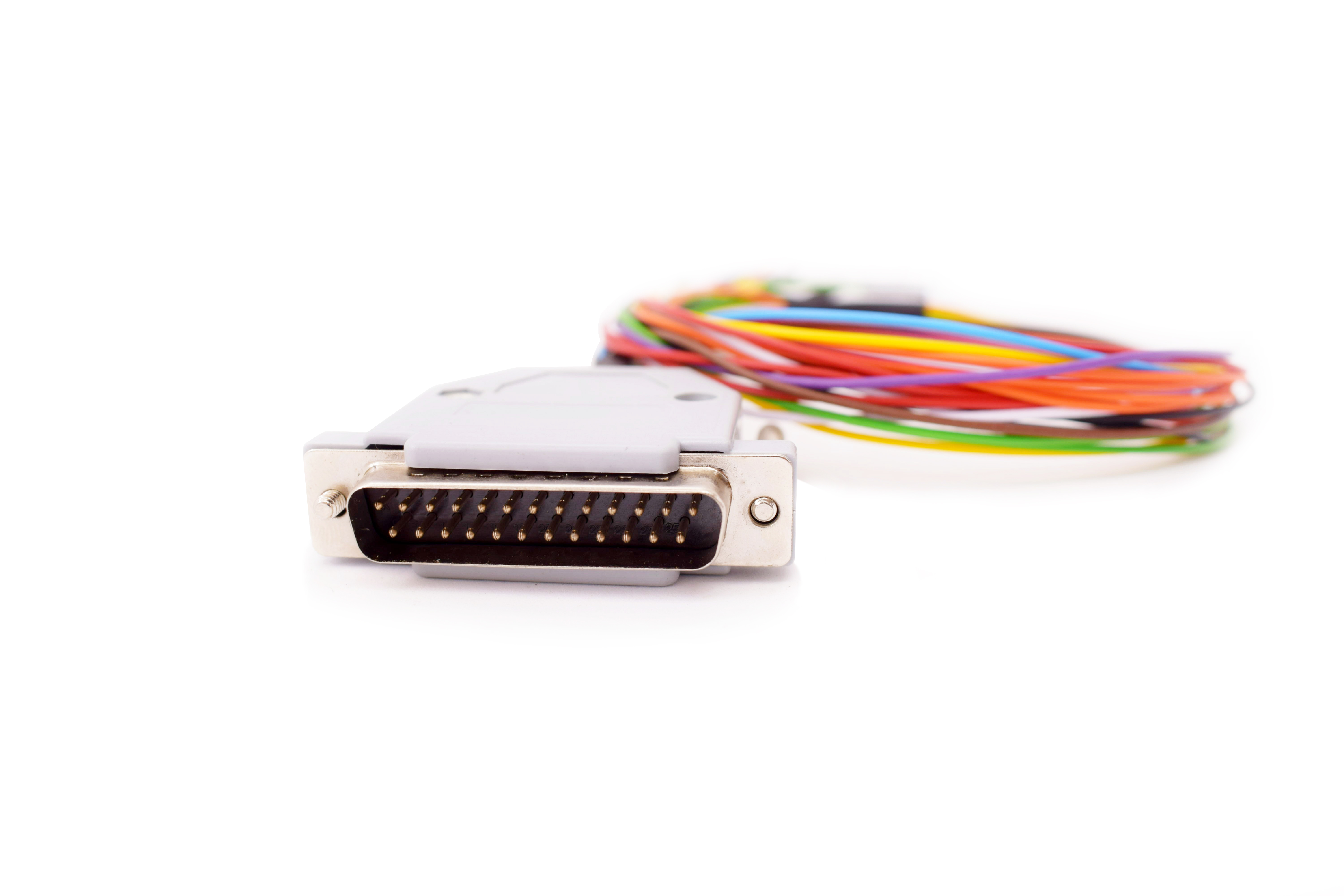 On the front panel of the device there is a DB-25 plug designed to connect to the ECU using the universal cable included in the delivery package. All cable wires are labeled for proper connection. The cable is equipped with additional contact pairs on the «VECU» and «VKEY» circuits, which allows to supply up to eight supply voltages (four small contacts and four large ones).