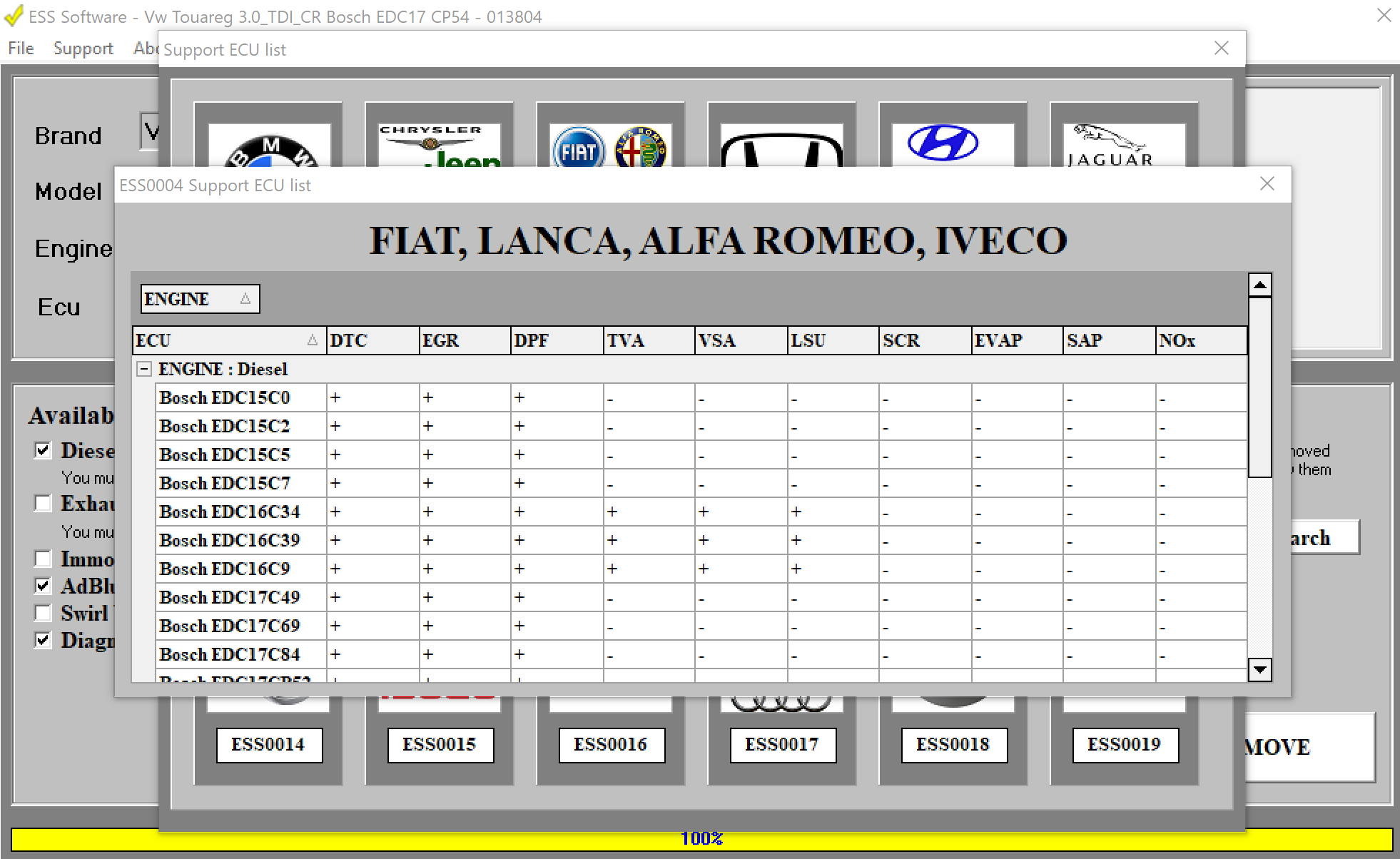 The software is marketed on a module basis (one module — one brand). It contains build-in tooltips on necessary additional actions when disabling some systems (e.g. required disabling of EGT and DP sensors when disabling DPF). Due to its high quality dump processing the ESS is used by professionals who are capable of developing solutions of system disabling themselves as ESS allows to do it fast and with guarantee.