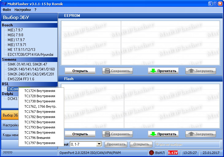 - BSL TriCore. Reading and flashing of ECU internal and external FLASH/EEPROM memory with Infineon TriCore TC1724, TC1728, TC1738, TC1762, TC1766, TC1767, TC1782, TC1792, TC1793, TC1796, TC1797 processors in BSL mode. The approximate short list of supported ECUs BOSCH M(E)17.9.7 (VAZ/UAZ), and ME17, ME (D, G)17, EDC17 (AMG, Audi, BMW, Citroen, Honda, Hyundai, KIA, Land Rover, Mercedes, Mini, Peugeot, Porsche, Renault, Saab, Skoda, Toyota, Volkswagen, Volvo).