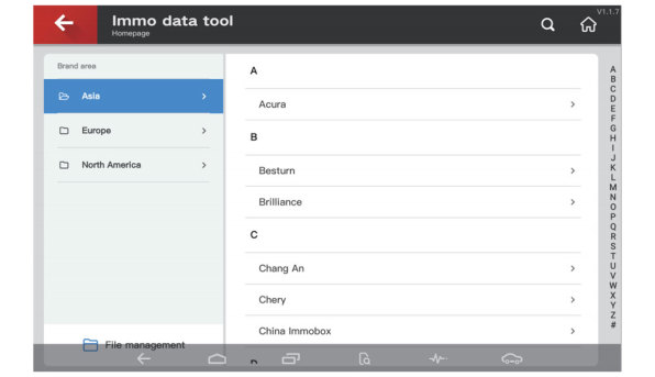 KEY TOOL PLUS supports over 20,000 car models worldwide. We can select the car brands and car models on the immo programming interface. On this smart platform, you can easily find the car models you need by brand area, brand name, and A-Z word search.